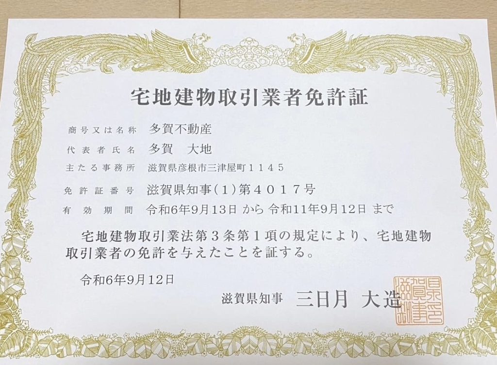 その書類を持って滋賀県庁の住宅課へ向かい、確認が終わると、宅建業の免許証(宅地建物取引業者免許証)が交付されました。