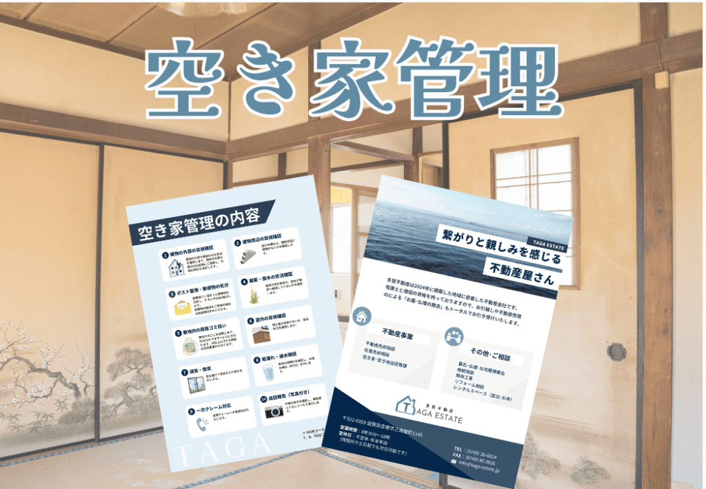 昨年の多賀不動産の開業時に「空き地・空き家管理サービス」を取り入れたことは、私にとって新しい挑戦でした。経験が豊富である不動産の売買とは違って、管理は少し異なる分野だからです。けれど、祖父母が住む県内の山里の地域を訪れた際に、空き家の多さが気になったことがきっかけで管理サービスを始めました。