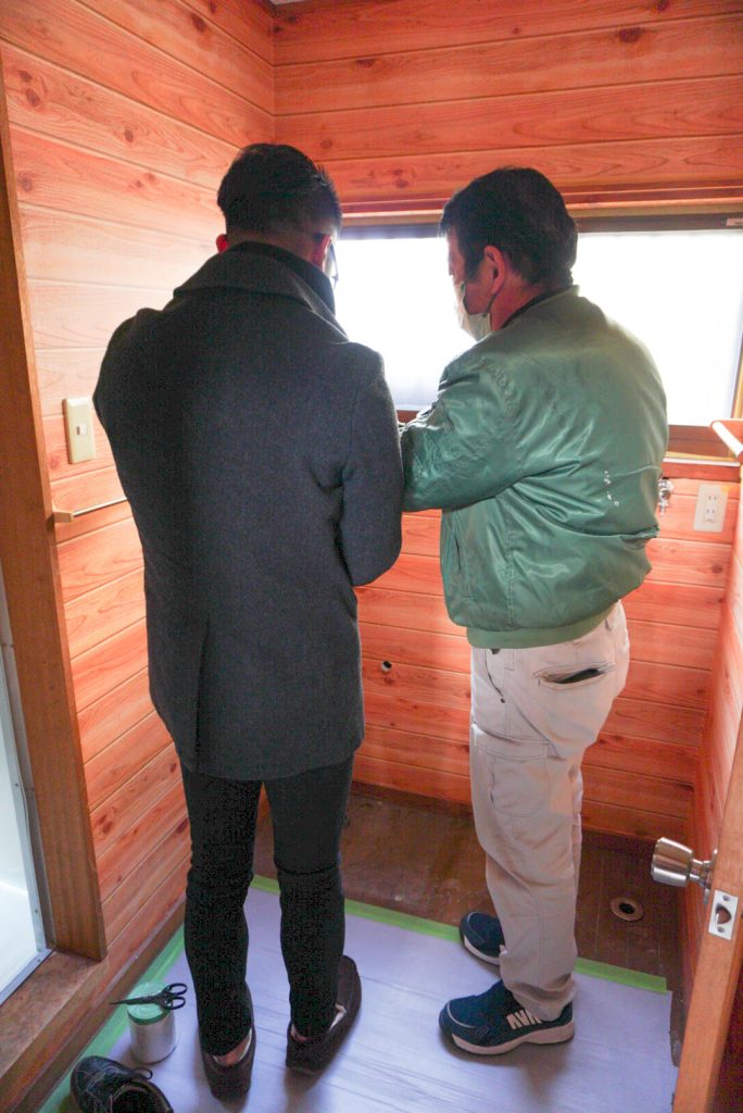 数日後にはパートナーたちとともにログハウス三湖へ向かい、「デザインK」さんとキッチンの壁紙や、洗面台の高さなどの打ち合わせを行いました。もうすでにキッチンが取り付けられていたので驚きました!