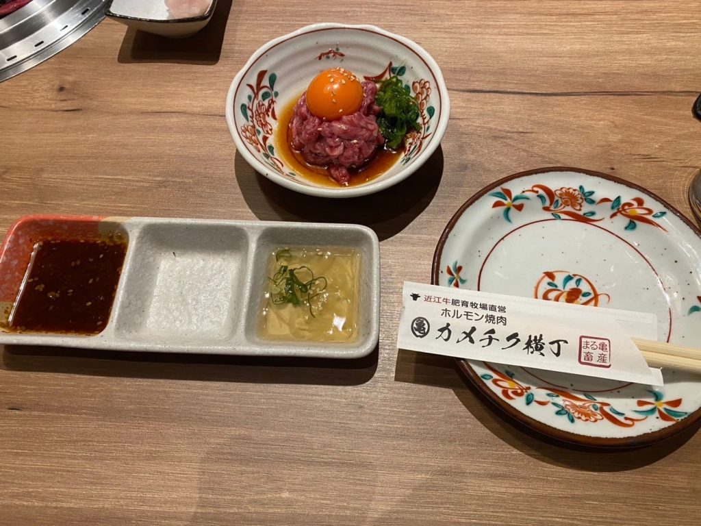 今回の食事は以前も伺ったことのある焼肉屋で、近江八幡市にあるカメチク横丁さんです。先輩だけでなく知人も同席されて、3人でわいわい食事をしました。その際に、この前京都の高島屋で買ったお祝いの品を、先輩に渡しました。お渡しするのが遅れてしまったのですが、喜んでいただけてよかったです。