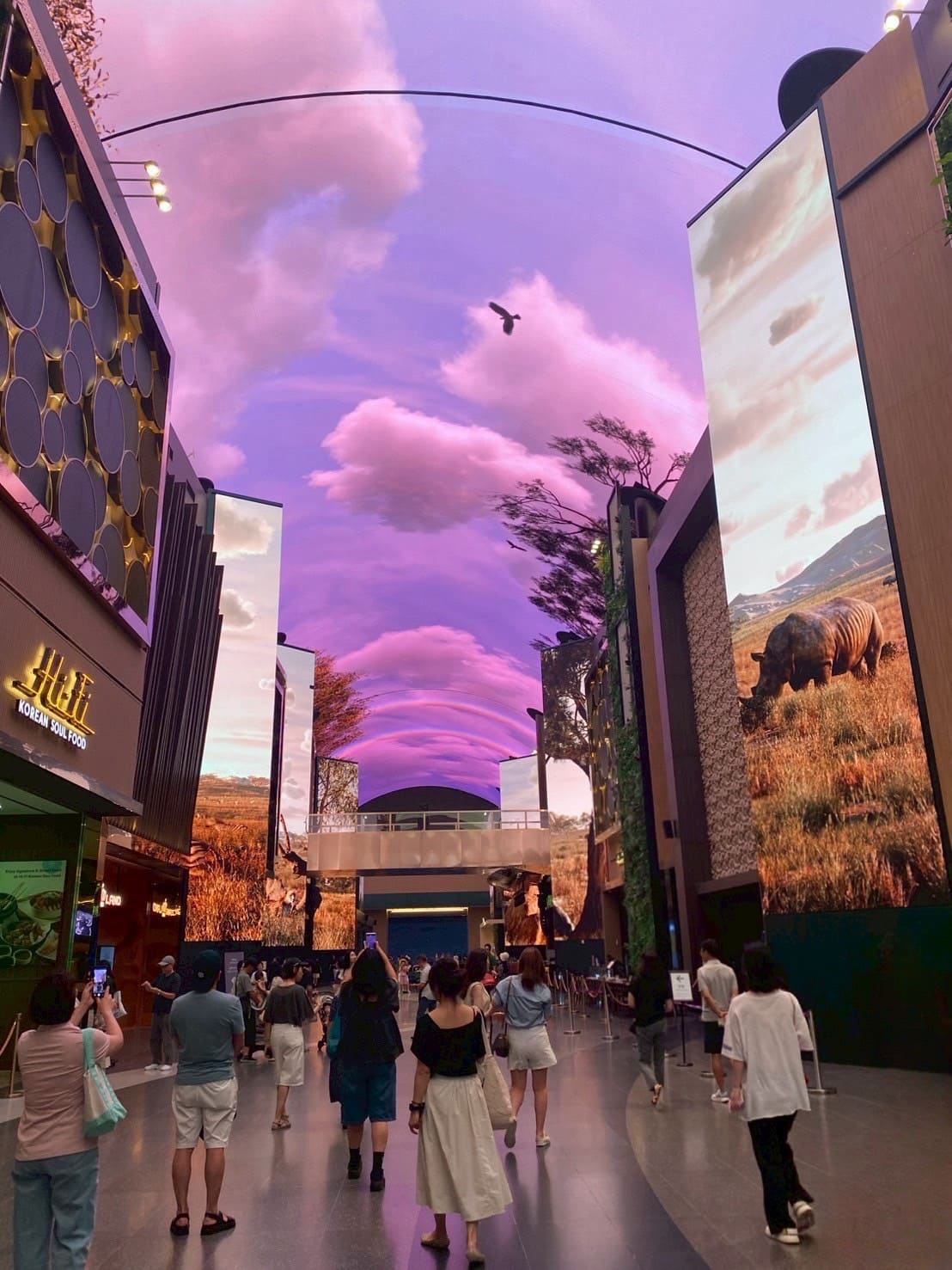 新世代のホテルといわれるだけあり、特にデジタル・エンターテインメント・ストリート「オーロラ」には圧倒されました。全長150mに及ぶ通路の天井や柱が巨大LEDスクリーンで覆われており、そこに幻想的な映像が映し出されて、神秘的な世界観が演出されるのです。今ままでに味わったことのない新感覚の体験で、しばらく3人とも見入ってしまいました。