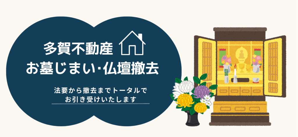 多賀不動産では、特定のお寺の檀家ではない方の受け皿として、手放される仏壇やお墓の法要と撤去をまとめてお引き受けしています。