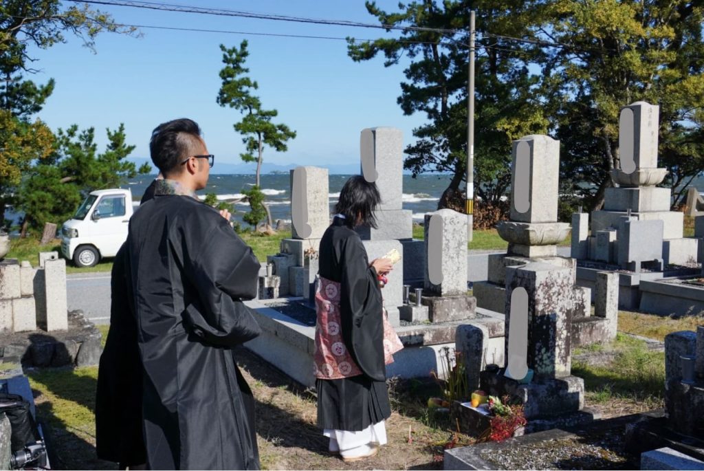 - 墓前にて僧侶による遷座法要