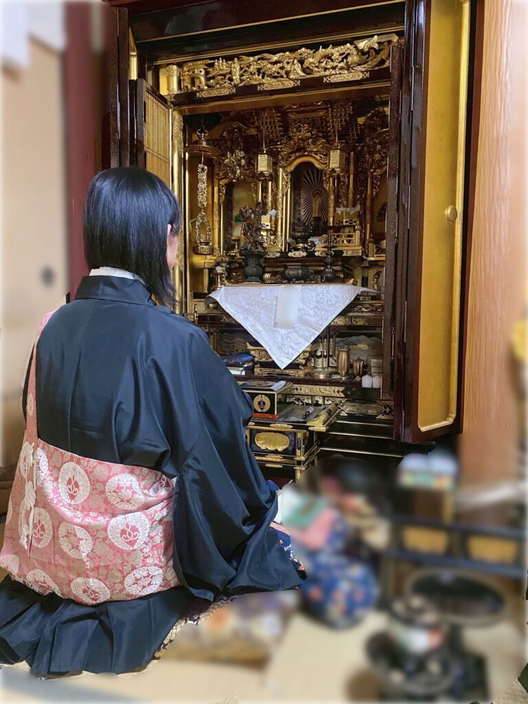 - 仏壇・お地蔵様の前で僧侶による遷座法要